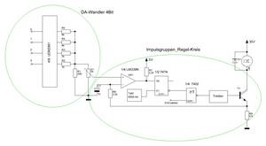Der Sollwert wird über vier 4Bit DA-Wandler, für jeden Motor einen bereitgestellt. Damit diese Regelung kontroliert abläuft ist der Ausgang des Comperators an ein D-FlipFlop, der mit 6,5 KHz getaktet wird verbunden.
